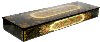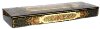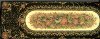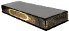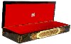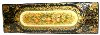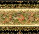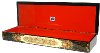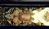 In this scene a bouquet of varied flowers - daisies and roses, along with all sorts of greenery are painted in gold paints, subdued reds and greens against the yellow background. These patters are drawn in gold metal paints and highlighted with blue and red tempera paints. The box sparkles with the gold detailing.