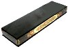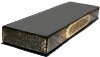 The box is constructed from paper-mache. Black lacquer is used to paint the exterior of the piece while red lacquer completes the interior of the box. A hinge has been fastened along the top of the composition and the box rests on the four small round legs. The work is signed and titled by the author at the exterior's bottom.