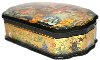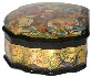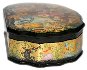 The box is made out of paper-mache. Black lacquer covers the exterior and red lacquer covers the interior of the box. Golden beads ornamentation frames the scene on the lid and wraps around the sides of the box. The box has a hinge from the top of the composition and rests flat. The work is signed with the artist's name, village,title and the year of 2013.