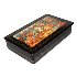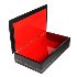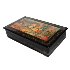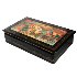 The box is made out of paper-mache. Black lacquer covers the exterior and red lacquer covers the interior of the box. The lid is hinged from the top of the scene, and the box rests on a flat bottom. The work is signed with the artist's name, Mstera and the title.