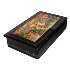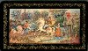 The scene is painted in the traditional Mstera style. The lid is decorated with intricate floral and leafy patterns painted with tempera paints. The box's sides are decorated with a nice gold leafy pattern.