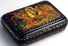 The box is made of good paper-mache made in the village of Palekh. The scene on the lid is decorated with gold beading. The sides of the box are adorned with a handsome gold ornament, with aluminium highlights. The box has a hinge above the composition and rests on a flat bottom. It is signed with the artist's name and year(2003).