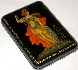 Description: This box is a splendid creation of Natalya Denisova-Babanova from the village of Palekh. Natalya was born in 1975 in the town of Kokhma of the Ivanovo Region. In 1995 she finished the Palekh Art School where she studied under guidance of V. Golov and V. Morokin. She likes to paint her works on the themes of folklore and literature.