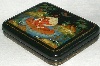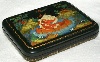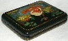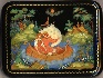 The box shows the rendezvous of a loving couple on board of a small sailing boat. Greens, blues, oranges and browns predominate here. The colors look magical because of the black lacquer exterior of the piece. The details are enhanced with gold and aluminum paint.