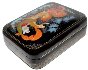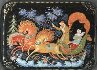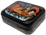 Description: Talented artist Galina Kuzmenko from the village of Palekh has painted this scene with a winter troika (three horse sleigh) speeding through the Russian countryside. A lonely lady hides from the snowstorm in the sleigh while a driver encourages the horses.