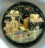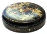 Description: This round box that shows a scene from the popular Russian fairy-tale "By the Pike's Will" or "Emelya and the Magic Pike" was painted by Palekh artist, Gagarina Olga.