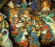 The palette is very bright and vividly shows each character. Each character is depicted in an animated fashion with brushwork that brings each to life. To bring the main focus on the Snow White and the Wicked Sorceress, the artist inlays gold leaf into her costume. The characters clothes are thoroughly contoured with bright gold and aluminum paint. This builds radiance and texture, both at the same time.