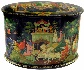 The artistry patterned upon this chest was applied primarily with egg-tempera paint. It features five large, well detailed scenes from the Russian classic entitled, "The Princess Frog". It is a fairy-tale in every sense of the term. Adventure, romance and mystery all surround this turbulent story about what really lies within face value. The settings are just as magical as the characters within them. The artists' desire to transfer the essence of the tale was accomplished.