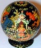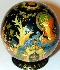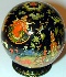 Description: This globe-shaped box was painted the talented Palekh artist Andrey Arapov. The whole surface of the globe is covered with colorful scenes that depict episodes from the popular Russian fairy-tale "The Humpbacked Pony". In the upper part of the globe, in the center, the artist depicts the Red Sun, which is the Slavonic god, Yarilo. The Sun has a human face, and it is surrounded with gold and aluminum rays, stars and multicolored clouds. Beneath the Sun, on the sides of the globe we can see the scenes depicting some key moments of the story. One of them shows how Ivan managed to catch the beautiful Tsar Maiden by the tsar's order. The Tsar Maiden, whose mother is the Moon, and whose brother is the Sun, sails in her small boat and plays the gusli, while Ivan is waiting for her. He has prepared a trap for her, setting up a tent with dinner and sweets inside. So, when the maiden enters the tent to taste the food, he will be able to capture her. The next scene shows Ivan and his faithful friend the Humpbacked Pony, standing near the beautiful palace. Beneath them there is the blue lake with different fish and a box inside. This box contains the ring of Tsar Maiden, and it is the next Ivan's task given him by the tsar: to bring the ring lost somewhere on the bottom of the ocean. Then we can see the huge Whale, the back of which is covered with forests, meadows and villages. This monster will help Ivan to find the ring of Tsar Maiden. Ivan and the Whale arrange a deal: Ivan has to find out why the While is punished and suffers loaded with villagers, having no possibility to swim like other fishes; while the While has to find the ring. To find out the reason of the Whale's suffering, Ivan and his pony rise high into the sky on their way to the Moon's palace. The Moon tells Ivan that the Whale is punished because he has swallowed three dozen ships. (this scene is depicted a little above the image of the Whale) After that the Whale lets the ships go, receiving his freedom, whereas Ivan receives the ring. The end of the story is happy: Ivan marries the beautiful Tsar Maiden, while the greedy tsar is punished.