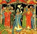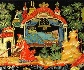 The composition is complex. It includes twenty-two individualized human figures, various animals, detailed architecture, and beautiful fairy-tale landscape. The scene is painted in red, brown, green and blue tones against the black background that makes the colors look brighter. Gold is abundantly used to detail each element of the composition. The scene shines with gold! Aluminum paint is used only to detail the architecture and the sea.