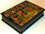Description: Olga Tsyganova from the village of Fedoskino is the creator of the large, splendid box. It features several scenes from the popular fairy-tale "Princess Frog". The central upper part of the composition features the beginning of the tale: the brothers launch their arrows at different direction to find their wives. Their arrows fall near the houses of rich and beautiful girls. In the left upper corner Ivan Tsarevich burns the frog skin of his wife, Vasilisa the Wise (his arrow fell in the swamp near the frog, and he had to marry this frog but later it turned out that the frog was the animal form of the beautiful bewitched girl). In the center of the composition Vasilisa the Wise creates a miniature lake full of white swans with just one nonchalant wave of her hand while dancing before the tsar. In the left bottom corner Ivan Tsarevich consults with Baba-Yaga trying to find out where he can find his wife, Vasilisa the Wise. This scene is very interesting painted. Baba-Yaga's hut on chicken feet differs from standard huts on chicken feet usually painted by various artists. More over near Baba-Yaga the artist has depicted her pygmy domestic dragon that replaces a cat or a dog. In the right bottom corner Ivan Tsarevich speaks with birds that later will help him to kill Koshchey who imprisoned Vasilisa the Wise. Just above this scene there is Koshchey's palace with imprisoned Vasilisa sitting inside. Nearby the artist has depicted also rather originally painted Koshchey in his animal form. In the right upper corner Ivan Tsarevich and Vasilisa the Wise return to their native kingdom.