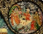 The box's exterior is richly decorated with intricate gold and aluminum floral ornamentation. Gold and aluminum paints are also used to detail the scenes.