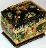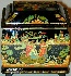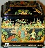 Description: Olga Tsyganova from the village of Palekh created this splendid box. It features the scenes from two different Russian fairy-tales "Marya Morevna", and "The Yourth Giving Apples". Its entire surface except its bottom and interior are covered with paintings. The lid's sloping sides are decorated with beautiful flowers painted in tempera paints and richly detailed with gold paints.