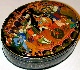 Description: This is another exquisite creation of the talented M. Lebedeva from the village of Palekh. It shows the performance of the strolling actors. The gymnasts show dangerous acrobatic feats riding bicycles. One of them stands on hands and holds the hen-layer with his leg; while another one makes fried eggs and pours out tea while pedaling. The amazed audience applauds crying: Bravo!