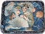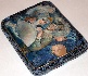 Description: This is a fresh original work of the famous Palekh artist Yekaterina Meshkova (for a long time this artist has been working under the surname Bykova). The box shows the lady and the gentleman who carry on an intrigue at the masked ball. The scene is painted in blue oils, and masterfully detailed with gold and silver paints. Gold is also used to paint a thin frame around the scene. The box's exterior imitates the coloring of marble (blue and lilac veins and blurry spots are scattered against the black lacquered surface).