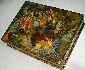 The scene is painted in bright tempera paints. Gold paint is applied with a very thin brush to add various details. The ornamentation of the box's exterior is amazing. On the box's sides Chisov has drawn the bright red roses accompanied by playing cards over gold metal leaf inlay.