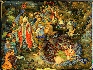 In the foreground we can see Alice who pursues the White Rabbit while in the background the artist has painted the Hat, the Hare and the Dormouse drinking tea, and the Cheshire Cat sitting on the tree. The rest part of the composition shows the Queen, the King and their suite.