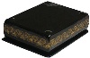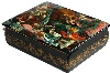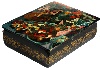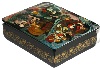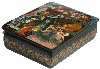 The box is constructed from papier-mache. Black lacquer is used to paint the exterior of the box while red lacquer completes the interior. The box's sides are adorned with an elaborate gold leafy pattern. A hinge is fastened to the left of the composition, and the box rests on four legs. The work is signed with the artist's name, Palekh the title and the year of 2009.