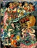 The scene is painted in bright red, blue, green and orange tones. The artist's use of golden and aluminum contours is splendid. Gold metal leaf inlay shines through the carriage and through the costume of almost each character painted here. This creates a magic atmosphere.