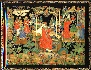 Each scene is elaborately painted in tempera paints and detailed with gold metal paint. Gold and silver paint is also used to decorate the box's exterior with nice floral patterns. The box is constructed from paper-mache. Black lacquer is used to paint the exterior of the piece while red lacquer completes the interior of the work. The lid is hinged and the box rests on four legs. The work is signed by the artist.