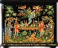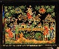 The box's lid and its right side show several scenes from the “The Tale of Vasilisa the Golden Braid and Ivan the Pea”. In this tale the Ferocious Dragon kidnaps the tsar's daughter, Vasilisa the Golden Braid. (this scene is painted in the center of the box's right side). He has the body of a man and the head of a snake. Vasilisa's brothers leave the kingdom in the hope of finding her. They meet a beggar who tells them that their sister is kidnapped by the Ferocious Dragon. The brothers find the Dragon's palace and their sister but suddenly the Dragon appears and kills the brothers. Vasilisa cries bitterly and wants to take vengeance on the Ferocious Dragon. Once she finds out that only Ivan the Pea is able to kill the Dragon. Meanwhile Vasilisa's mother, goes for a walk in the garden, comes to the marble well, scoops fresh, crystal water with the gold dipper, drinks cold water and doesn't notice a pea at the bottom of the dipper (this scene is painted in the center of the box's lid). She swallows the pea and after that she becomes pregnant. Soon tsaritsa gives birth to a child, Ivan the Pea (this scene is painted in the right upper corner of the box's right side). Ivan grows quickly and turns into a mighty bogatyr. When he finds out the story of his family, he decides to save his sister and brothers. Like his brothers, he meets the beggar who tells him that his sister can be found in the Ferocious Dragon's palace (this scene is painted in the left bottom corner of the box's right side). Then Ivan the Pea comes into the dark forest and finds there the hut on chicken legs. Baba-Yaga who lives in that hut helps Ivan to find the way the palace of the Ferocious Dragon (this scene is painted in the right bottom corner of the box's right side). In the end of the tale Ivan the Pea kills the Ferocious Dragon, saves his sister, Vasilisa the Golden Braid, revives his brothers with the help of the life water, and returns with his brothers and sister to the native kingdom (this scene is painted in the left part of the box's lid).