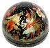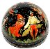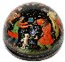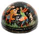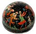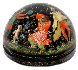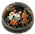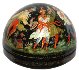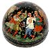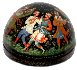 Description: This festive semi-spherical box is a creation of Galina Kuzmenko from the village of Palekh. This talented artist was born in 1948. During 1969-1974 she studied in the Palekh Art School. Since 1974 she worked in the Palekh workshops. Her favorite themes to depict are folklore and literature.