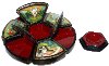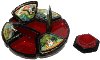 The box is made out of paper-mache. Black lacquer covers the exterior and red lacquer covers the interior of the box. The lid in the center isn't hinged, the rest of the sections are hinged, and the box rests on three rounded legs. It is signed with the name of the artist.