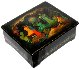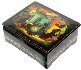 The box is made out of paper-mache. Black lacquer covers the exterior and red lacquer covers the interior of the box. The lid is hinged at the top of the scene, and the box rests on the four legs. It is signed with the name of the artist, the village of Palekh, and a year.
