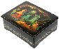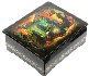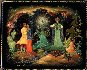 Description: This interesting semi-antique Palekh box was painted by artist Bureeva. This splendid piece shows a fragment from the fairy-tale "The Mistress of the Copper Mountain" written by Pavel Bazhov. Here we can see Katyusha and Danilo the Master in front of the Mistress. We can see a stone flower on the back side.
