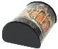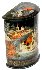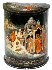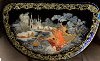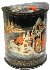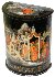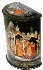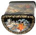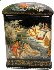 This box have the painting all over the surface. In one of scenes Emelya has made it to the Tsar's court in the kingdom's central palace. The Tsar is infuriated with Emelya's luck and power. He has also received numerous complaints from the kingdom's residents and the soldiers to the left are about to take Emelya away. However, when the Tsar's daughter steps in and falls in love with Emelya, the Tsar decides to spare him and let them marry, but after the wedding he puts them in a barrel, seals it, and throws it out to sea. Emelya uses his power to free himself and his wife. As they approached the palace Emelya requested that a palace be built opposite the Tsar's, and it happened. The couple, after receiving forgiveness and blessings from the Tsar, lived the rest of their days without a care in the world, all because of the magic pike.