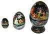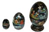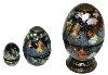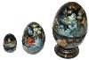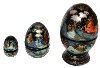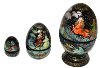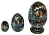 The box is made out of paper-mache. Black lacquer covers the exterior and red lacquer covers the interior of the box. The lid of each egg is hinged approximately at the half of each composition, and the box rests on a flat bottom. The box is signed with the name of the artist on a bigger egg below the painting.