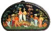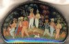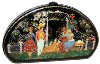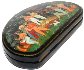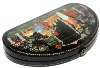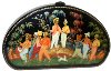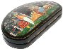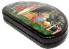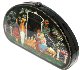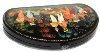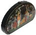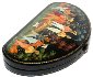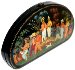 Description: This dual-sided purse-shaped box was paintedby a talented artist Dmitry Bonokin from the village of Palekh. The subject of the work is based on the popular novel "The Adventures of Tom Sawyer" written in 1876 by the great American writer, Mark Twain. Both sides of the box and its lid demonstrate adventures of a mischievous boy, Tom Sawyer, and his friend, Huckleberry Finn. Here we can see such recognizable scenes when Tom became the leader of an army and his date with Becky Thatcher.