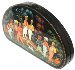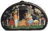 The box is constructed out of paper-mache. Black lacquer covers the exterior and red lacquer covers the interior of the box. The two sides of the box are hinged in the middle. The work is signed with the artist's name, Palekh, the title and the year of 2012.