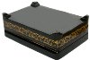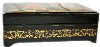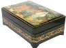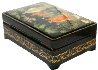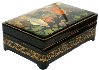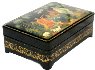 The work is a good example of intricate Palekh art. The Palekh tradition of the black lacquer exterior acting as the background for the composition works wonders for the palette and the decoration. The greens and blues become electric, the reds and oranges passionate. Hair thin gold and silver accents have been used extensively throughout the composition adding rich luminescence and delicacy to the piece. The Snowmaiden's figure is painted to look transparent to remind the fact that she is the daughter of nature.
