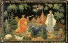 Description: This splendid box was painted by the talented Palekh artist Arapova Anastasa. It shows a scene from the popular Russian fairy-tale "The Snowmaiden" or "Snegurochka". The composition is showing the date of Lel and Snowmaiden. Lel is playing his flute to Snowmaiden while the Snowmaiden is speaking with birds.