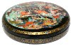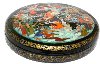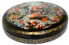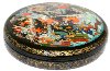 Description: This round box was painted by the talented Palekh artist Nataliya Kornilova. It shows several scenes from the popular Russian fairy-tale "By the Pike's Will" or "Emelya and the magic Pike". At the top of the composition Emely is catching the magic Pike by a buckle, then buckles are going by themselves (by the Pike's will) home with water. Then, the stove is rushing without horses and bringing Emelya to the Tsar's Palace.