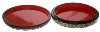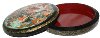 The box is constructed from paper-mache. Black lacquer is used to paint the exterior of the piece while red lacquer completes the interior of the work. The lid isn't hinged , and the box rests flat. The artist wrote her name, and the village name of Palekh along the bottom of the composition in gold paint.