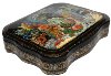 The box is constructed out of high-quality paper-mache. Black lacquer is used to paint the exterior of the box and red lacquer is used to paint the interior of the box. The lid is hinged from the top of the scene, and the box rests on four legs. The work is signed with the name of the artist, Palekh, and the year of 2015.