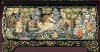 Description: Zhiryakov Alexey is the talented Palekh Master responsible for the delightful assembly of color and design before you. Delicious detail, stunning decoration and a rather sublime palette make this composition quality in the highest degree. Here the artist has chosen to depict several scenes from the Russian Fairy-tale "Finist the Falcon".