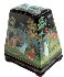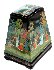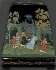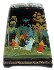 The work is a good example of intricate Palekh art. The Palekh tradition of the black lacquer exterior acting as the background for the scenes works wonders for the palette and the decoration. The greens and blues become electric, the reds and oranges passionate. Hair thin gold and silver accents have been used extensively throughout the composition adding rich luminescence and delicacy to the piece.