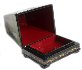 The box is constructed from paper-mache. The exterior of the box is painted with black lacquer while the interior is completed with dark red lacquer. The exterior is decorated with nice gold ornaments. The lid is hinged and the box rests on the four legs. The work is signed with the artist's name and the village of Palekh and the year of 2016.