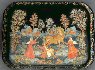 Description: This humorous composition has been painted by the experienced Palekh painter, Nina Bogachova. Bogachova currently resides in Palekh, as a well-established artist.
