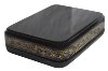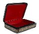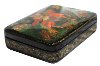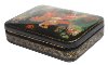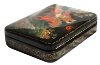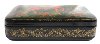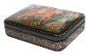 The box is constructed from paper-mache. The exterior of the box is painted with black lacquer while the interior is completed with dark red lacquer. The edges of the lid are adorned with a simple pattern composed of gold beads whereas the box's sides are decorated with more complex gold ornament.